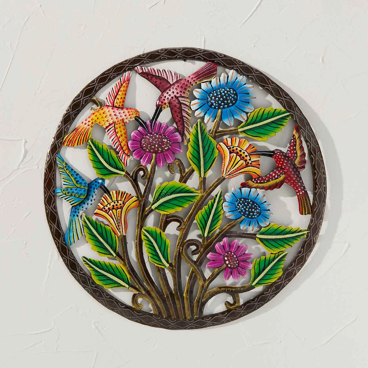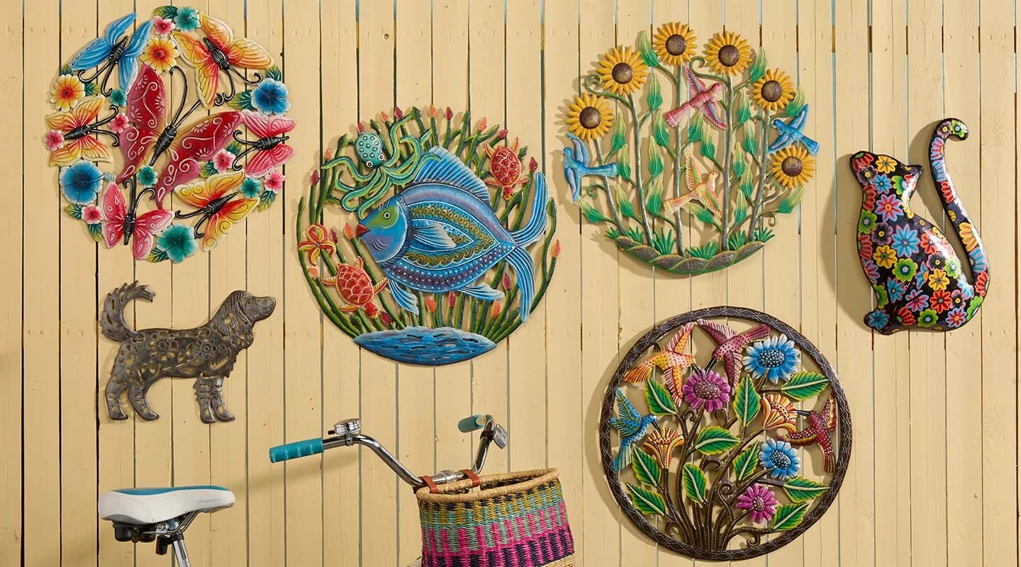 One of our top-selling garden items, this one-of-a-kind wall piece brings eye-catching color to fences, walls, and more. Each is crafted from reycled oil drums that are cut, embossed, and painted entirely by hand.