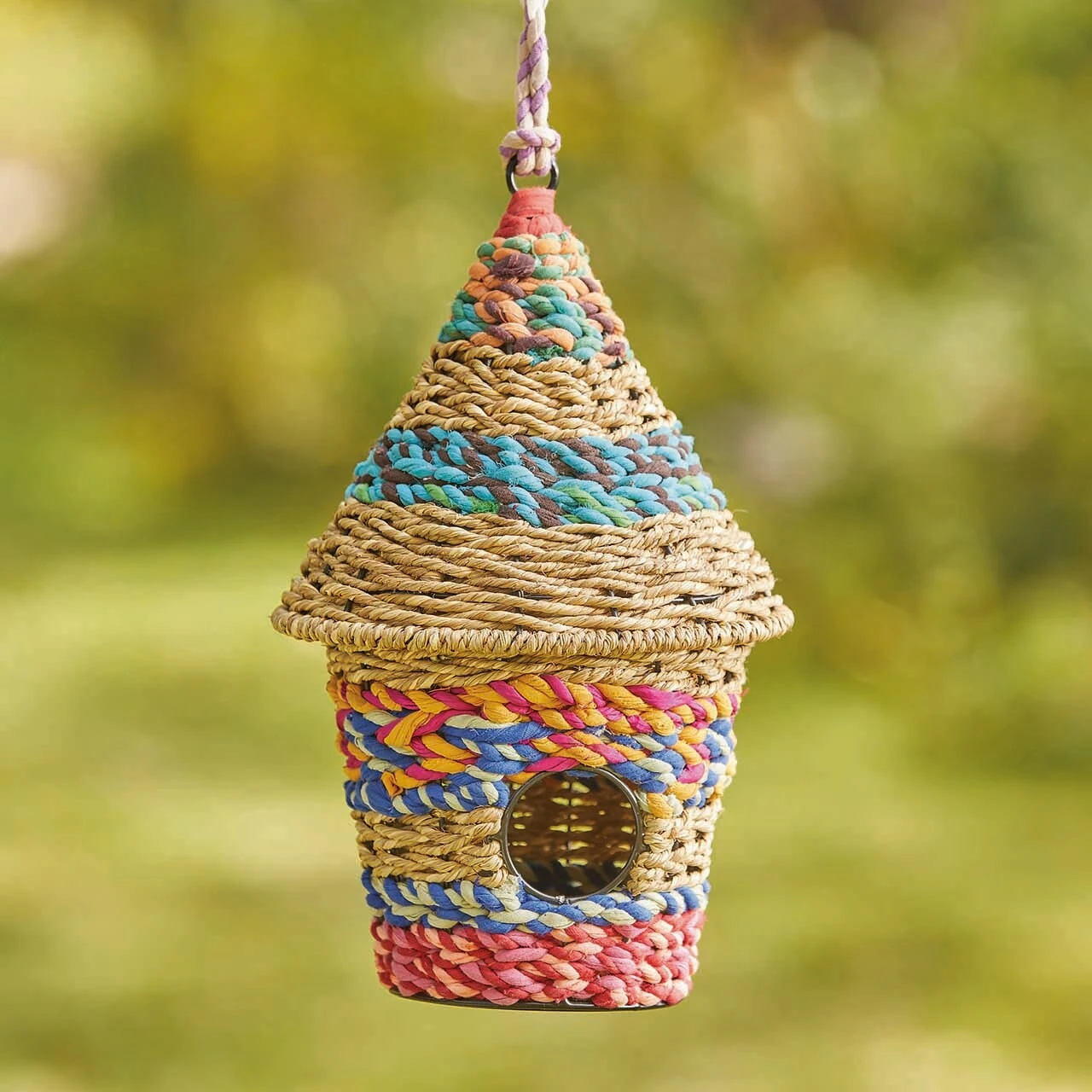 This one-of-a-kind birdhouse is made from natural seagrass and eco-friendly, upcycled cotton saris woven around a sturdy wire frame. Makes a beautiful addition to covered porches or a colorful gift for collectors and birders!