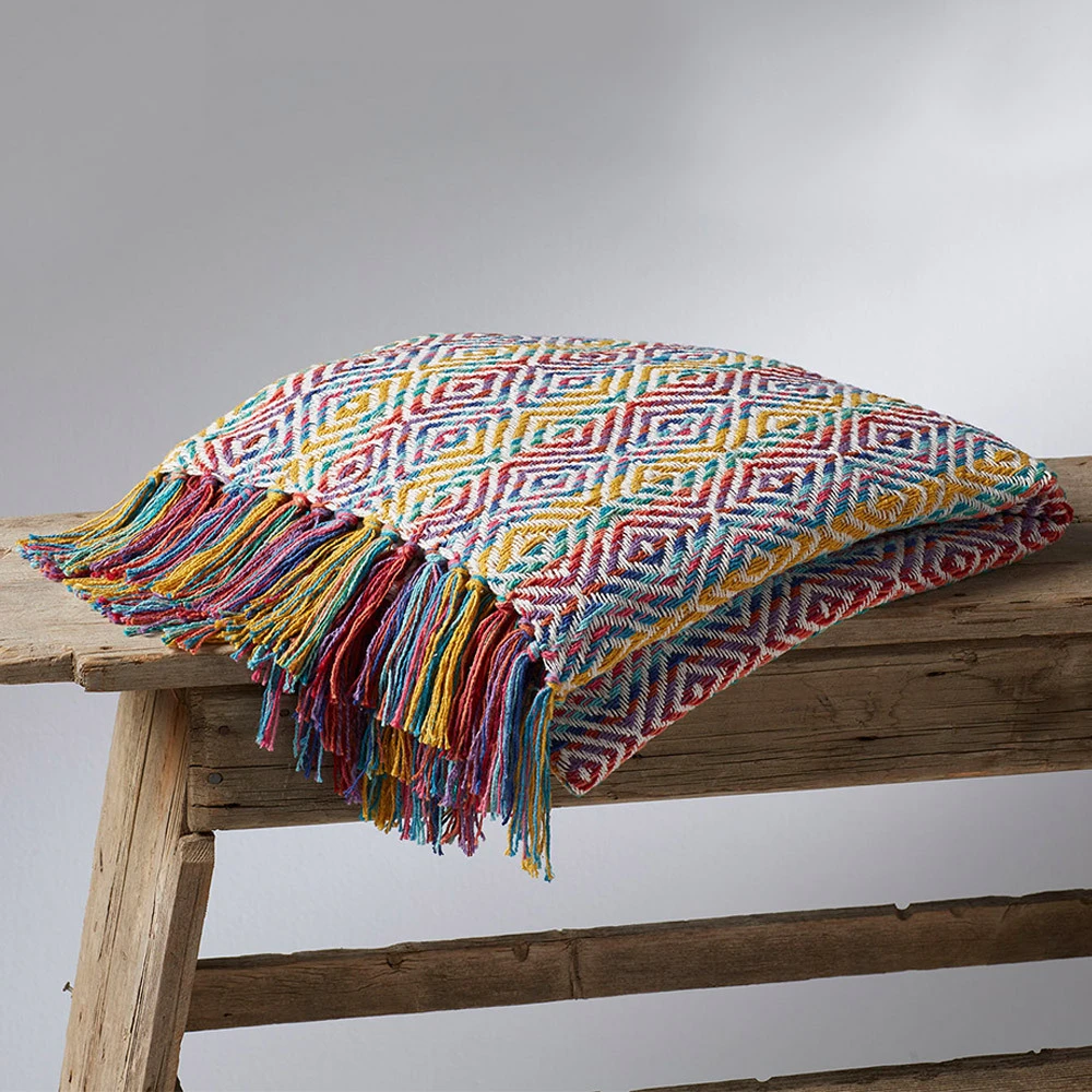 This rainbow-colored cotton blend throw with a subtle bird's eye pattern is made from recycled clothing repurposed into thread, perfect for fending off the evening chill in cozy style.
